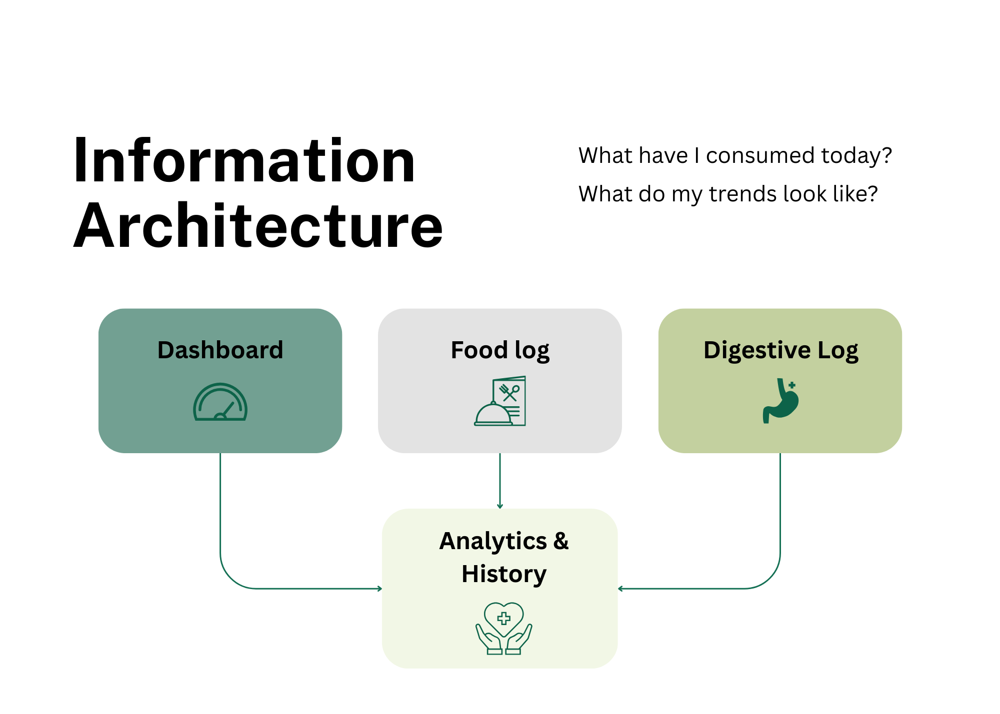 Before diving into the UI, I mapped out the Information Architecture to ensure the app directly answered the user’s core questions: "What have I consumed today?" and "What do my trends look like?" To make the data actionable and easy to navigate, I structured the app around 4 Main Features: