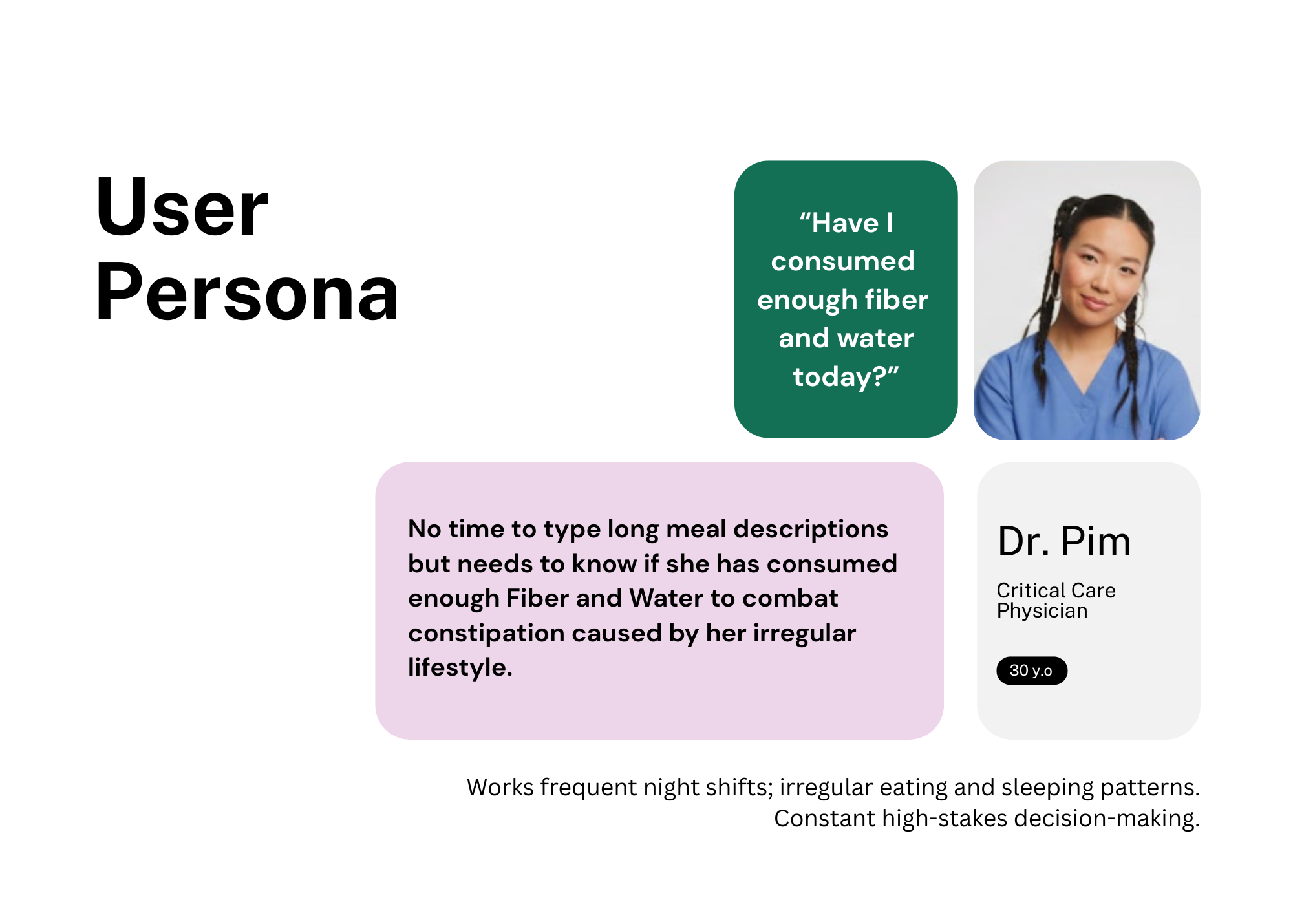 To ensure the design served those with the least amount of time, I developed a User Persona of Dr.Pim to guide the decision-making process.