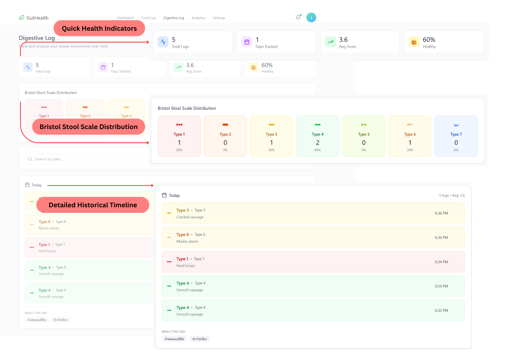 Quick Health Indicators: The top dashboard provides an instant snapshot of gut health through metrics like Total Logs, Average Score, and a Healthy Percentage (currently 60% Healthy).